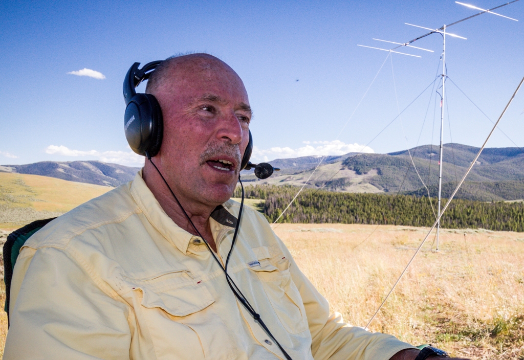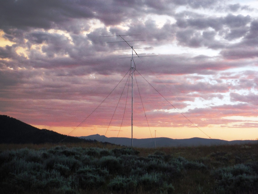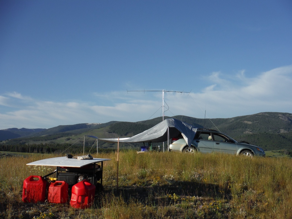 Raising the 6M5XHG on 24' mast, using falling derrick to lift the mast off the prop Panoramic view of the operating site toward the east W7GJ operating 6m Es W7GJ operating 6m Es under the tarp W7GJ operating double hop on 6m Es K7SGP picking calls out of the 6m pileup Taking down the antenna on Monday morning |