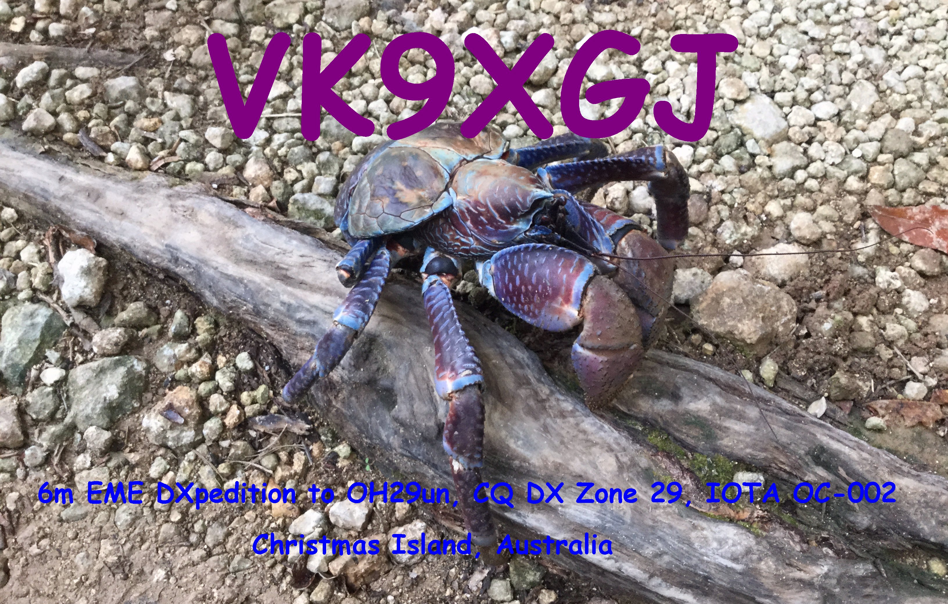 | Friday September 15 The weather before dawn was cloudless and clear - perfect for visual aiming of the antenna ;-) Today I worked an additional 23 stations, bringing the total to 30 after the first full moon pass today. In order, the new stations worked were: N7IP, W6XU, W7GJ, KB7Q/7, K6EME, JG2BRI, NJ6P, ES6RQ, US0LW, UT7QF, SM7FJE, GM3POI, OZ4VV, ZL3NW, ON4GG, ON4IQ, EA8DBM, JG1TSG, G8BCG, OH7KM, S57RR, G5WQ, and OK1RD. Also copied today but not worked yet were these 16 stations: W5ADD, W7JW, KG7H, K5DOG, K7RWT, W9GA, AJ7LL/7, W7EW, OH6MIK, S51ZO, GD0TEP, FK8CP, F5LNU, G3WOS, JA7QVI and KJ9I. Windows with NA are very limited, but my main ground gain lobe lines up with moonrise in the NE USA. I was surprised that there were no W1, W2 or W3 stations interested in working a rare DXCC during their moonrise. Maybe they are waiting for the better cndx this weekend... 6m EME cndx were very bad today, with the degradation above 3.5 dB and the Kp hovering around 5 all day. The result was very erratic polarizatiion and QSB. Hopefully this weekend will be better! I will be on again in the morning for my moonrise. The full operating schedule is here: http://www.bigskyspaces.com/w7gj/VK9%20Schedule.xls There are also pdf copies of the schedules for both VK9CGJ and VK9XGJ on my DXpedition web page: http://www.bigskyspaces.com/w7gj/Indian%20Ocean%202017.htm I also updated the above planned operating schedule on my DXpedition website, to correctly reflect the local times here in Cocos (6.5 hours ahead of GMT, in the same time zone as Yangon, Myanmar). The 7 hour difference from GMT shown for Christmas Island is correct. We had a delightful dinner with Vk4KJJ, his son and family at their home here in Cocos. We were treated to some barbecued beef with local coconut honey glaze. It rained on and off throughout the evening. |