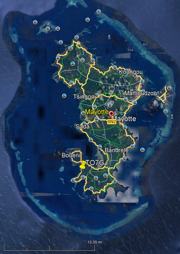 PHOTOS AND UPDATESTue Sep 6 We arrived from Paris this morning an hour late, and then had delays getting the luggage and renting a car. On top of that, it took us longer than anticipated to wait for the ferry and then drive to the opposite end of the main island, where we are staying. By 1400 local time, I was able to start assembling the mast and trying to figure out where to put it. I cut off some palm fronds on the south side of the antenna and decided to try to squeeze the antenna and mast as far to the north as it will fit when I put it on the mast. That means it will be aiming out over the flat concrete roof of the house (which is 15' above the ground) when the antenna (on a mast 24' above the ground) is aimed anywhere to the east of north-south line. There still may be some azimuths where I will not be able to aim on the horizon due to trees, but I am hopeful - it will be very close! I do have the mast up and guyed and sitting on the prop, waiting for the antenna. I have not decided exactly where to try to set up the station yet, but the front room where I was hoping to set up is the master bedroom and only air conditioned room, so that does not appear to be an option (although it sure would make the amp happy!). I am not sure I have enough extra coax with me to reach the back bedroom, so I may just set up out in the Dining Room just inside the sliders from the yard. I will be setting up the antenna and the station tomorrow with the goal being to be QRV all night on EME. I may have to go to bed early tonight because after 40+ hours of traveling and working all afternoon on the mast siting and assembly, I am pretty hungry and tired! I did have lots of company while working outside this afternoon 😉 The Flying Foxes (fruit bats) here are HUGE and swoop by quite often. And the whole troop (if that is what you call a number of them) of lemurs made their appearance today to check out what was going on here, and shouted out lots of encouragement (or scolding - I couldn't tell). I will try to post a short video of them at sunset today on my FACEBOOK page so you can hear the racket they make! Hoipefully the next update will be to report that the gear all still works after traveling halfway around the world, and that I am making contacts! Oh, and I am able to send this email because of the wi-fi here at the house 😉 So hopefully I won't need my GPS puck to set the computer clock this trip. I did buy a SIM card for my cell phone but have not had a chance to install it yet, and with WiFi and Whatsapp, it doesn't seem necessary. Wed Sep 7 Got up at 8 am and started assembling the antenna. Things went slowly because of tremendous back pain. I did get the antenna up by late afternoon and had the station set up by sunset. The yard did pose considerable challenge for assembling the long yagi, and I had to add the last director after the antenna was mounted on the mast in order to have space to install it. The antenna is fairly close to the house, and the 50' of LMR-600 Ultra Flex feedline reaches inside the house to the Dining Room. I wound up deciding to add on the extra 25' of LMR-600 I brought, so I could set up the station in the living room at the rear of the house, more out of the way (see attached). I am still trying to figure out how to shut off the overhead ceiling fans and all the LED lights and the many solar powered lawn lights that are causing such a high noise level. I have made some reduction in noise but still have many things to investigate. When aiming due north, not elevated, I measure 15 dB of noise more than a 50 ohm resistor. There also is currently loud music apparently coming from an outdoor party in that direction on the beach and all the flood lights are on at the outdoor sports court immediately to my north, so both of those are likely contributing to my high noise level. I am planning to try moonbounce at starting at 1630Z today. Thu Sep 8 #1 MOON PASS Last night was difficult, as I began to understand some of the problems trying to operate from this small lot. I am only good for about 30 degrees and below when the moon is setting south of west here, because the front of the antenna is in the tree branches and the rear is above the 15' high flat concrete roof which prevents raising antenna as well as measuring elevation. I had some noise problems and have removed all the problems from MY location, but there are a number of other nearby noise sources out of my control. From now on, I will try to follow the operation schedule shown on my website, which provides time for a nap when the moon is too high. In case you have not read my DXpedition web page, the operating schedule is here: http://www.bigskyspaces.com/W7GJ%20Programs/W7GJwebpage/Mayotte%20Schedule.xls or http://www.bigskyspaces.com/W7GJ%20Programs/W7GJwebpage/Mayotte%20Schedule.pdf If I can be available when I am not on the moon, I will be monitoring FT8 on 50.313 - please call, since I am monitoring with JTALERT and it will announce if anybody calls CQ or calls me. Despite all the difficulties with noise and aiming, I completed with 17 stations off the moon and 4 9K2 stations direct via TEP: 9K2GS 9K2GR 9K2NO 9K2OD PA5Y S59A OH3SR K2ZD GM3POI G8BCG K9RX S57RR VE3MMQ N7NR K8OM N1DG N8JX AC0A ZS4TX N3XX K0DAS N0LNO MNI more were decoded. GL and I hope to have better success and more aiming possibilities as the moon moves further north! Fri Sep 9 #2 MOON PASS The total EME contacts after the second pass is 35. I also worked 5B4ALJ on TEP before my moonrise. A Kp index of 4 today made the EME operation especially challenging. The contacts logged today were: 5B4ALJ ZS6NK JG2BRI ZL1RS JG1TSG JA7QVI HA0DU ZL3NW S51ZO SM7FJE KJ9I YL2AO WB9Z N9IW W8PAT F1IXQ XE2OR K4PI Many more were copied, and hopefully they can be added to the log in the coming days. Please remember to witch back and call me with TX1 unless you are seeing my trace or decoding me in the immediately preceding sequence. Q65 provides no other way for
