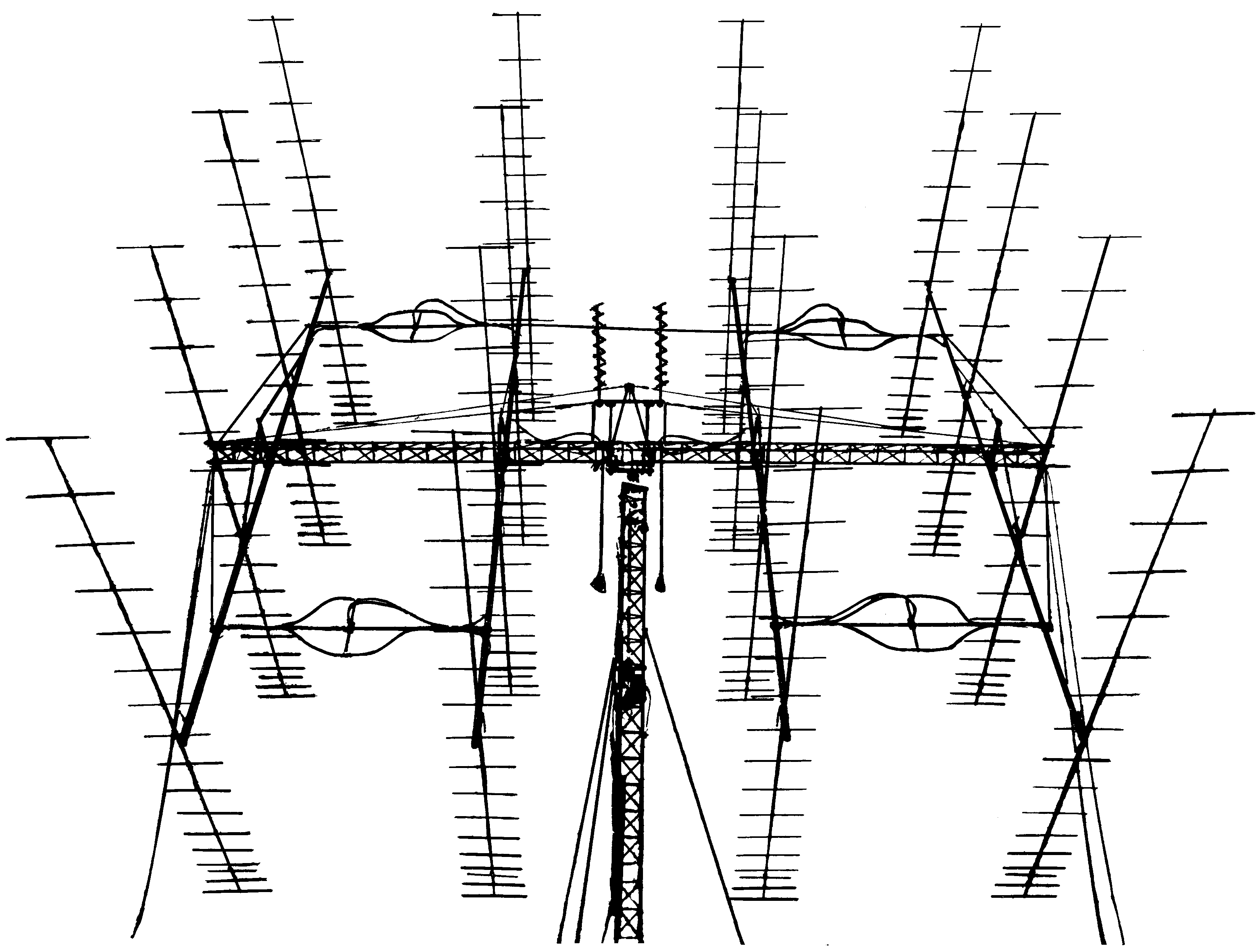 The current 2m antenna (shown below) was raised in December, 1984. It replaced previous arrays of 12x19 element Cushcraft "Boomer", 8x16 element F9FT, and 4x16 element F9FT yagis. It utilizes 75 ohm 3/4" CATV hardline for phasing lines, connecting directly to the custom 75 ohm feeds of each antenna. The four four-way power dividers are custom made for splitting 75 ohms all all ports; the center four-way power divider splits the main 50 ohm feedline (1-5/8" gas Heliax) into four 75 ohm ports. CATV "entry fittings" were used to connect the CATV hardline to the power dividers. The receiving preamplifier an Transmit/Receive relays are mounted directly on the center power divider. A unique (at the time) innovation for these yagis was to incorporate the vertical truss supports at the center of each yagi directly into the boom-to-mast clamp for the yagi. This means that each yagi can be properly trussed before putting it up into the array.