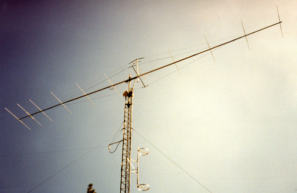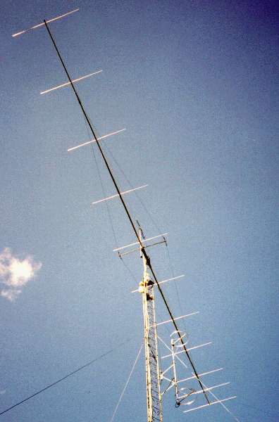 The antenna was used for the first year at a height of 20', and worked surprisingly well at that height. It had a very clean pattern, an almost perfect match (couple of watts reflected at 1500 forward), and great vertical (H plane) lobes for catching E skip coming in at various angles. It proved itself to be a very efficient antenna, completing EME contacts with SM7BAE and WA4NJP. It was raised to 70' a year later, for the second summer Es season (and an easy EME contact with K6QXY). By the end of the second summer of operation, QSO's had been confirmed with 49 U.S. states, 6 Canadian provinces, and 5 DXCC countries. Although it was a fantastic performer and a joy to use, it was removed in October 1997 to make room on the top for "Big Stealth". After the demise of Big Stealth in July 1998, it was again returned to service. Before it was raised the second time, it was camo painted (earning the nickname, "Mini Stealth") and side-to-side braces were added.