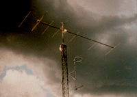 In order to help make up for this unfortunate combination of factors, it was decided to construct an antenna large enough to more reliably make contacts with larger stations in other countries by bouncing signals off the moon instead of relaying on the ionosphere. On October 27, 2001, an array of four 6M9KHW 9 element yagis was raised, in order to provide an additional 4.5 db gain over the big single yagi above, and thereby improve the chances for success in the admittedly difficult challenge of making moonbounce contacts on this frequency band. As you can see in the photo, the "GLEAP" (Geomagnetic Latitude Equalizer Antenna Project") was located 55' east of the big tower holding the single 70' yagi. Details of the design, construction and performance of this array are documented on a separate web page. |